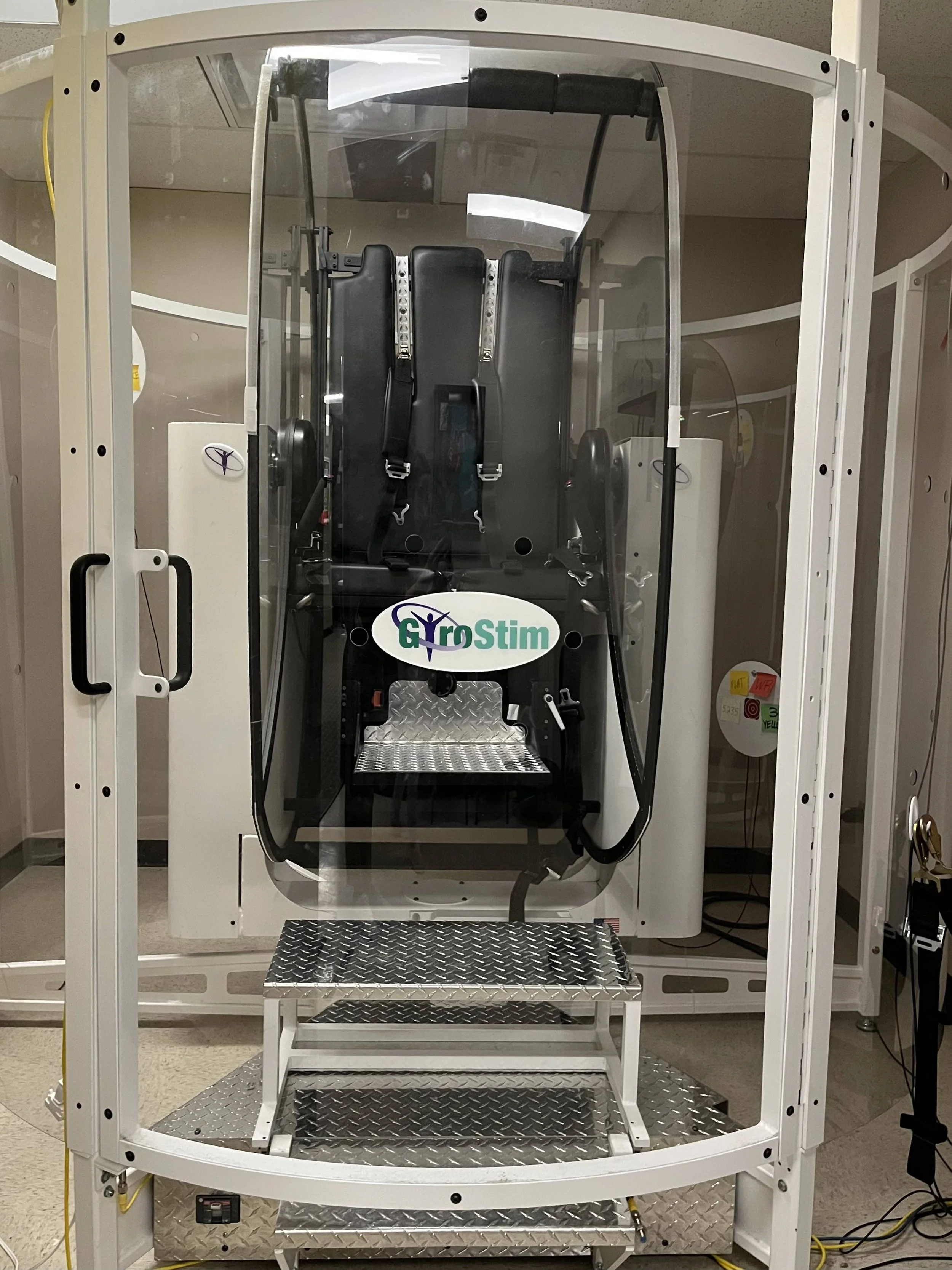 GyroStim Therapy is a computer-controlled, multi-axis rotating chair that provides balance stimulation for neurorehabilitation, treating issues from new neural connections. GyroStim Therapy retraining the brain's sensory and motor systems through controlled rotations and interactive tasks like aiming lasers at targets.